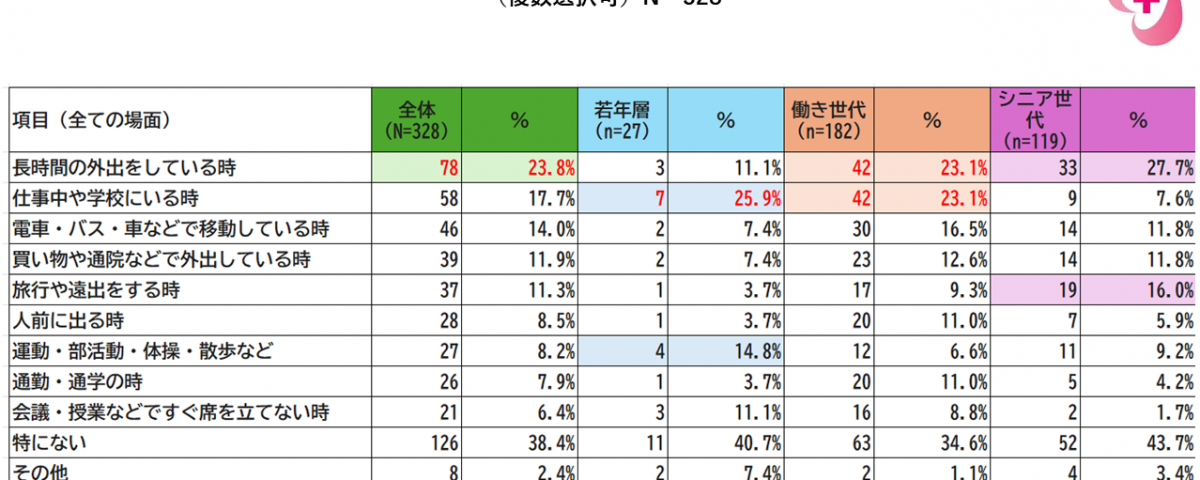 2026年4月22日『尿漏れはシニアだけの悩みではない』 10代は学校生活、20~50代は仕事中・外出時 60代以上は長時間外出で不安 尿漏れ経験者328人の世代別調査で見えた“困り方の違い”
