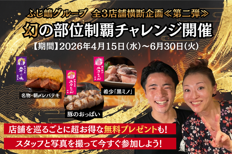 2026年4月22日【ふじ嶋グループ】スタンプラリー企画が進化!予約必須の“幻の部位”を巡り、豚ホルモンとお酒を”無料”で楽しめる「幻のメニュー制覇チャレンジ」として4月15日よりリニューアル始動