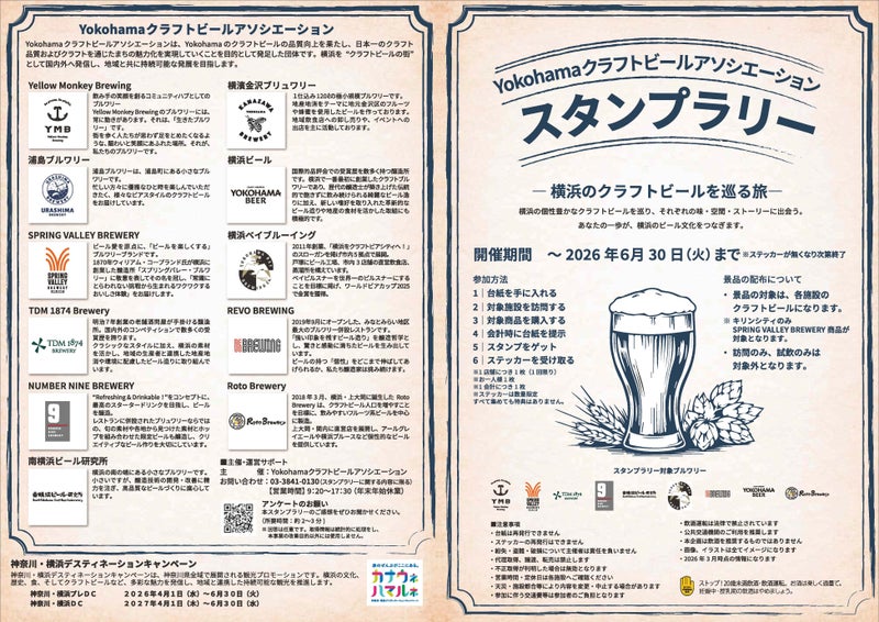 Yokohamaクラフトビールアソシエーションでは、「神奈川・横浜デスティネーションキャンペーン プレキャンペーン」特別企画として、参画するブルワリーを巡るスタンプラリーを開催します。