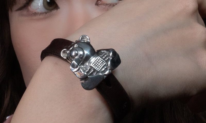 本作は、hide x CRAZY PIG DESIGNS コラボレーション第三弾として発表された『PSYCHO TEDDY BEAR KEYRING』をブレスレットとして再構築した作品です。