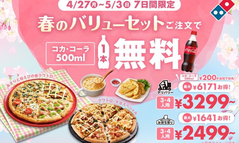 株式会社ドミノ・ピザ ジャパン(代表取締役兼CEO:ディーター・ハーベル、本社:東京都品川区、以下:ドミノ・ピザ)が展開する国内No.1シェアを誇る宅配ピザチェーン ドミノ・ピザは、2026年4月27日(月)~5月3日(日)までの7日間限定で、「春のバリューセット」をご注文いただいた方に、コカ・コーラ500ml1本を無料でプレゼントするキャンペーンを実施いたします。