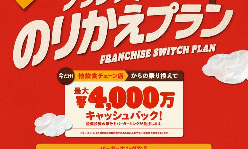 2026年4月22日バーガーキング(R) が飲食FCオーナー様向けに「フランチャイズのりかえプラン」を開始!他飲食チェーンからバーガーキングへのりかえると最大4,000万円キャッシュバックします!目指せフランチャイズ日本一!