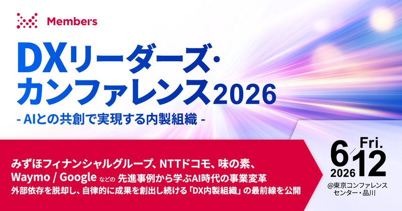 DX現場支援で顧客と共に社会変革をリードする株式会社メンバーズ(本社:東京都中央区、代表取締役社長:髙野 明彦、東証プライム:2130、以下「メンバーズ」)は、「DXリーダーズ・カンファレンス2026」を2026年6月12日(金)に東京コンファレンスセンター・品川にて開催します。本カンファレンスでは、「AIとの共創で実現する内製組織」をテーマに、株式会社みずほフィナンシャルグループ、株式会社NTTドコモ、味の素株式会社、Waymo / Googleといった国内外の大手企業10社超のDXリーダーが登壇し、AI活用やアジャイル開発、CX(顧客体験)向上、内製組織やプロセス構築などのリアルな事例を紹介します。また、会場内では大手プラットフォーマーの最新情報や、DX内製化におけるポイントを提供する展示ブースなども展開予定です。