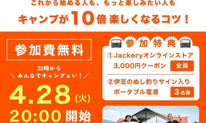 第1回目の4月28日(火)は、人気キャンプYouTuber「伊豆のぬし釣り」のお二人をゲストにお呼びし、ポータブル電源を活用した楽しいアウトドアライフをテーマに、お話しいただく予定です。キャンプなどアウトドアが好きな方、ポータブル電源に興味がある方など、どなたでも気軽にオンラインで参加できます。