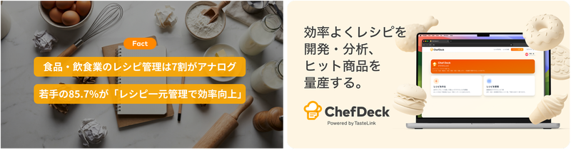 2026年4月23日Published by on 2026年4月23日【食品・飲食業 開発担当者426名調査】若手の85.7%が「レシピ一元管理で効率向上」と回答も、現場は紙・Excelが7割超──レシピDXの遅れ鮮明に食のプロにオファーができるプラットフォームを運営する株式会社TasteLink(所在地:東京都渋谷区、代表取締役:戸門慶)は、2026年2月5日から2月8日の間に食品メーカー・飲料メーカー・外食チェーン・ホテル飲食...