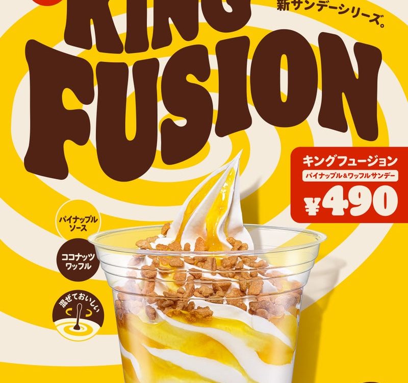 2026年4月23日Published by on 2026年4月23日バーガーキング(R) の新サンデーシリーズ「キングフュージョン」登場!ソフトクリームに爽やかな甘さのパイナップルソースとザクザクなココナッツワッフルを混ぜておいしい『パイナップル&ワッフルサンデー』新発売株式会社ビーケージャパンホールディングス(本社:東京都千代田区、代表取締役社長:野村 一裕)は、2026年4月24日(金)より、新サンデーシリーズ「キングフュージョン」から、爽やかな甘さのパイナップルソ...