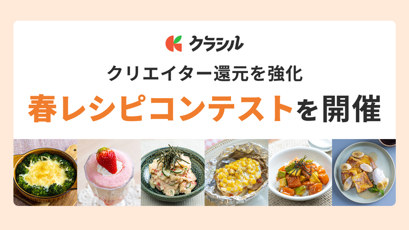 2026年4月23日Published by on 2026年4月23日「クラシル」、クリエイター還元を強化。自社主催による「春レシピコンテスト」を開催クラシル株式会社(本社:東京都港区、代表取締役社長:堀江 裕介、以下「クラシル社」)が運営するレシピ動画サービス「クラシル」は、同アプリ内においてレシピを投稿するクリエイターへの還元強化を目的に、レ...