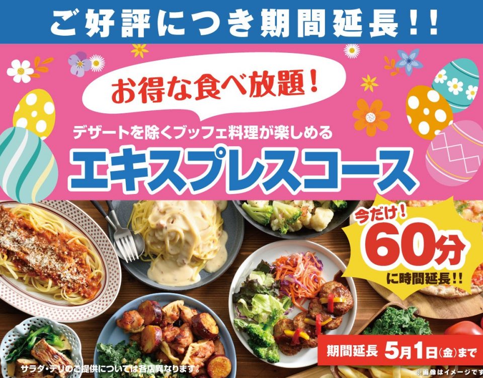 2026年4月23日Published by on 2026年4月23日【5/1まで延長決定!!充実の60分食べ放題!!】ニラックスブッフェで大人気の45分『エキスプレスコース』を「15分」拡大!価格以上の満足感でコスパ最強!充実の食べ放題を思う存分お楽しみください!ニラックスブッフェのHPはこちら : https://www.nilax.jp/