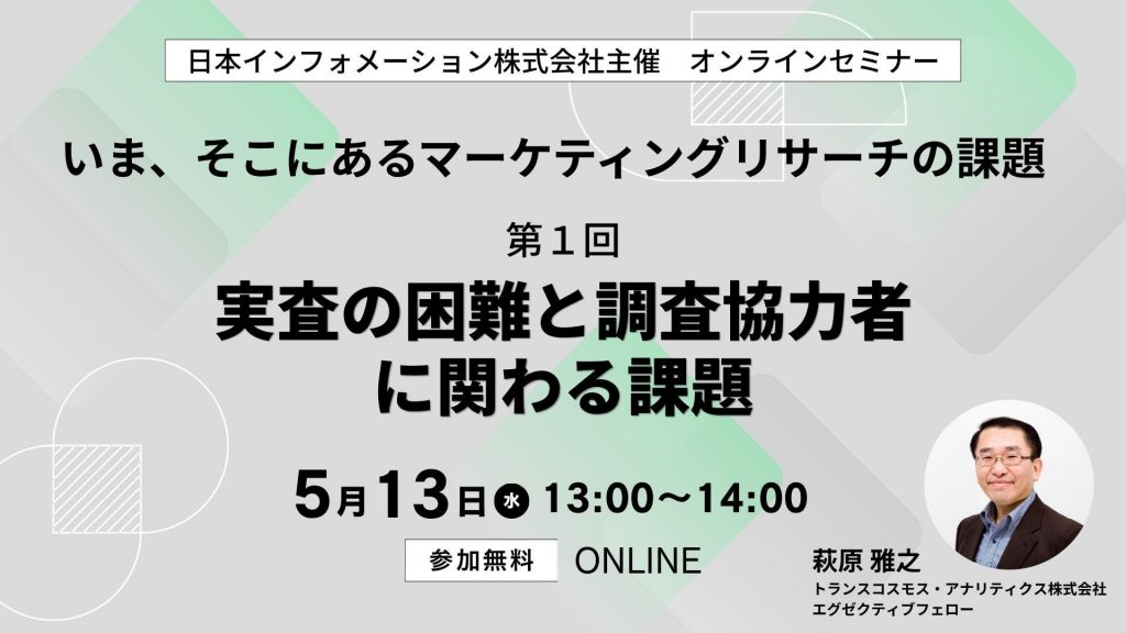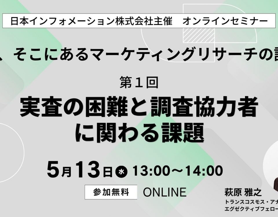 2026年4月23日Published by on 2026年4月23日【5/13(水)13:00開催】オンラインセミナー『いま、そこにあるマーケティングリサーチの課題 第1回:実査の困難と調査協力者に関わる課題』総合マーケティングリサーチ会社の日本インフォメーショ […]