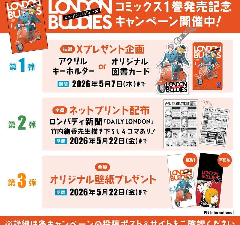 2026年4月22日Published by on 2026年4月22日【コミックス第1巻発売記念!】『ロンドンバディーズ』オリジナルグッズが当たるSNSキャンペーンやネットプリント配布などの豪華キャンペーン開催中&コミックショートPV公開!株式会社パイ インターナショナル(豊島区)は2026年4月22日(水)発売『ロンドンバディーズ1』の刊行を記念したキャンペーンを実施いたします。 『ロンドンバディーズ』コミック...