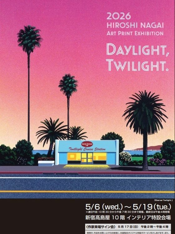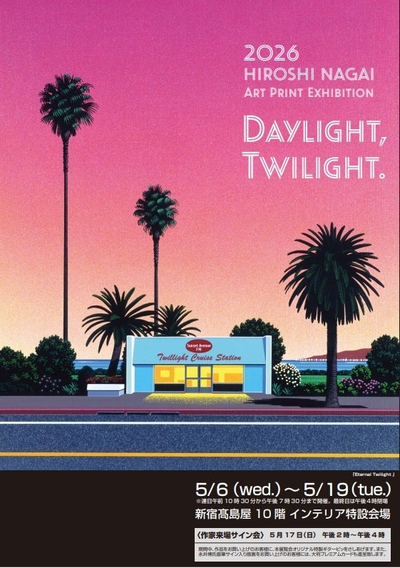 2026年4月22日Published by on 2026年4月22日【新宿高島屋 10階特設会場】HIROSHI NAGAI ART PRINT EXHIBITION2026「DAYLIGHT,TWILIGHT.」5/6~開催。5/17永井博氏 来場&サイン会 決定!