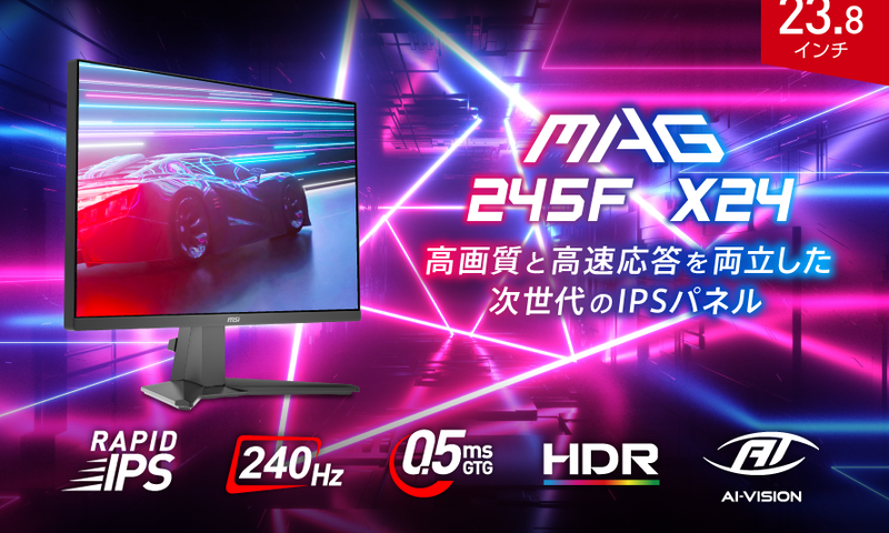 この度、エムエスアイコンピュータージャパン株式会社は2026年4月30日(木)より、ゲーミングモニターの新モデルを発売いたします。高いゲーミング性能とコストパフォーマンスに優れた『MAG』シリーズから、240Hzの高リフレッシュレートと応答速度0.5ms(GTG、最小値)を実現するRAPID IPSパネルを採用し、よりゲームを楽しめるAIビジョン等のゲーマー向け機能を搭載した「MAG 245F X24」が新たにラインナップに加わります。