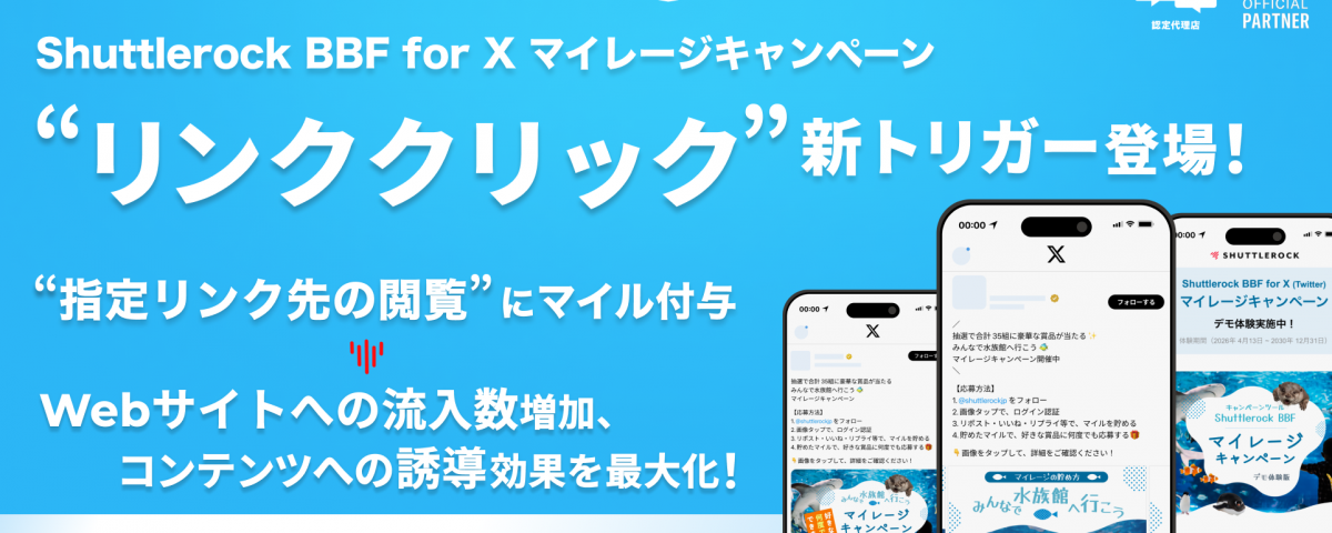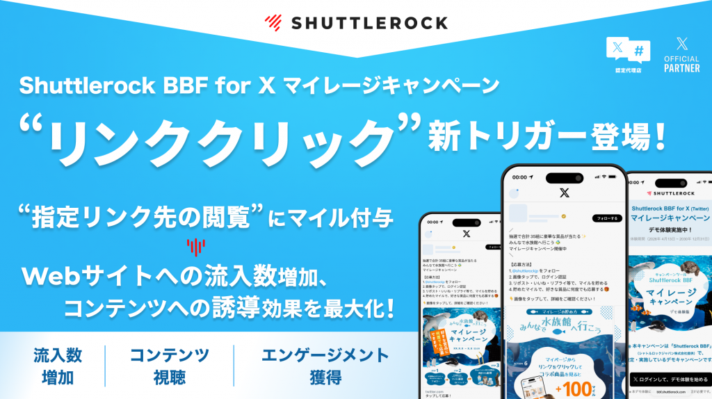 2026年4月23日Shuttlerock BBF、「リンククリック (Webページの閲覧)」をトリガーにする X マイレージキャンペーンが実施可能に。「流入数の増加 & ブランド・商品への理解促進」施策へのサポート強化